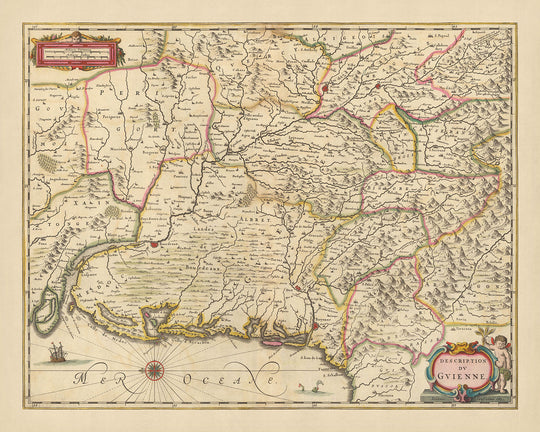 The 'Description du Guienne' map is more than just a cartographic representation of a historical region. It is a window into the past, offering a glimpse into the geographical, political, and cultural landscape of late 17th-century France. This map is an invaluable addition to any collection, appealing to historians, cartographers, and art enthusiasts alike. Its detailed depiction of Guyenne, combined with its artistic beauty and historical significance, makes it a truly unique and luxurious piece.