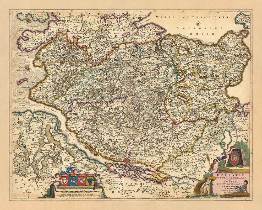 In addition to these cities, the map also outlines the political divisions of the time, providing a glimpse into the administrative structure of the late 17th century. The Duchies of Holstein, Dithmarschen, Stormarn, and Wagria are clearly demarcated, offering an insight into the regional dynamics of the era. The borders, towns, and landmarks are intricately drawn, reflecting Visscher's attention to detail and commitment to accuracy.