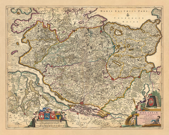 This map is not just a geographical representation, but a historical document that takes you back to the late 17th century. It offers a unique opportunity to explore the past, understand the political and geographical landscape of the time, and appreciate the craftsmanship of one of the finest mapmakers of the Dutch Golden Age. Whether you are a history enthusiast, a lover of old maps, or someone who appreciates fine art, this map of Holstein by Visscher is a treasure to behold.