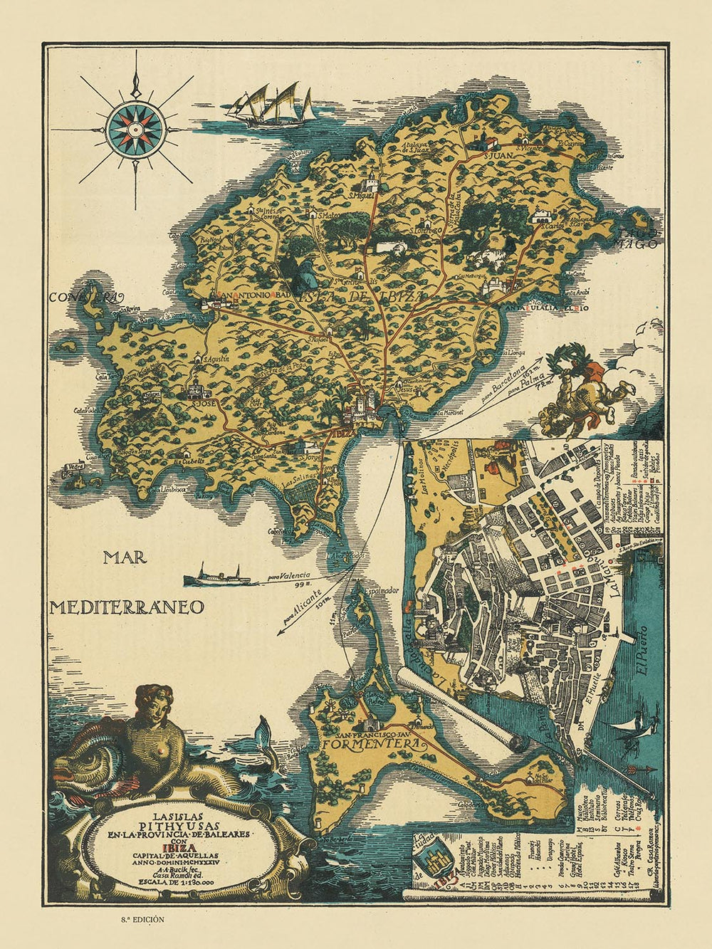 This 1934 map of Ibiza, by A. A. Bucik, is a beautiful and informative cartographic work of art. It is a pictorial tourist map of the island, embellished with images of the primary buildings and monuments, and showing roads and major tourist attractions. The map also includes a large inset plan of Dalt Vila (the Old City).