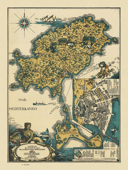 Old Map of Ibiza and Formentera, 1934: Pictorial Chart of Tourist Attractions, Landmarks, Mediterranean