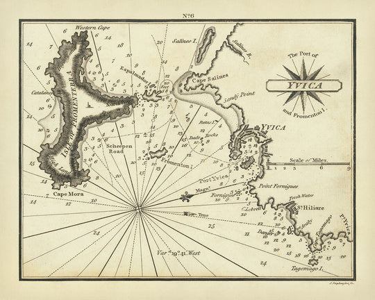 This 1802 map of Ibiza and Formentera, titled "The Port of Yvica and Fromenton I.", is a rare and exceptional example of early 19th-century cartography. Created by William Heather, a renowned mapmaker known for his precision and attention to detail, this map offers a fascinating glimpse into the Mediterranean region during a pivotal time in history.
