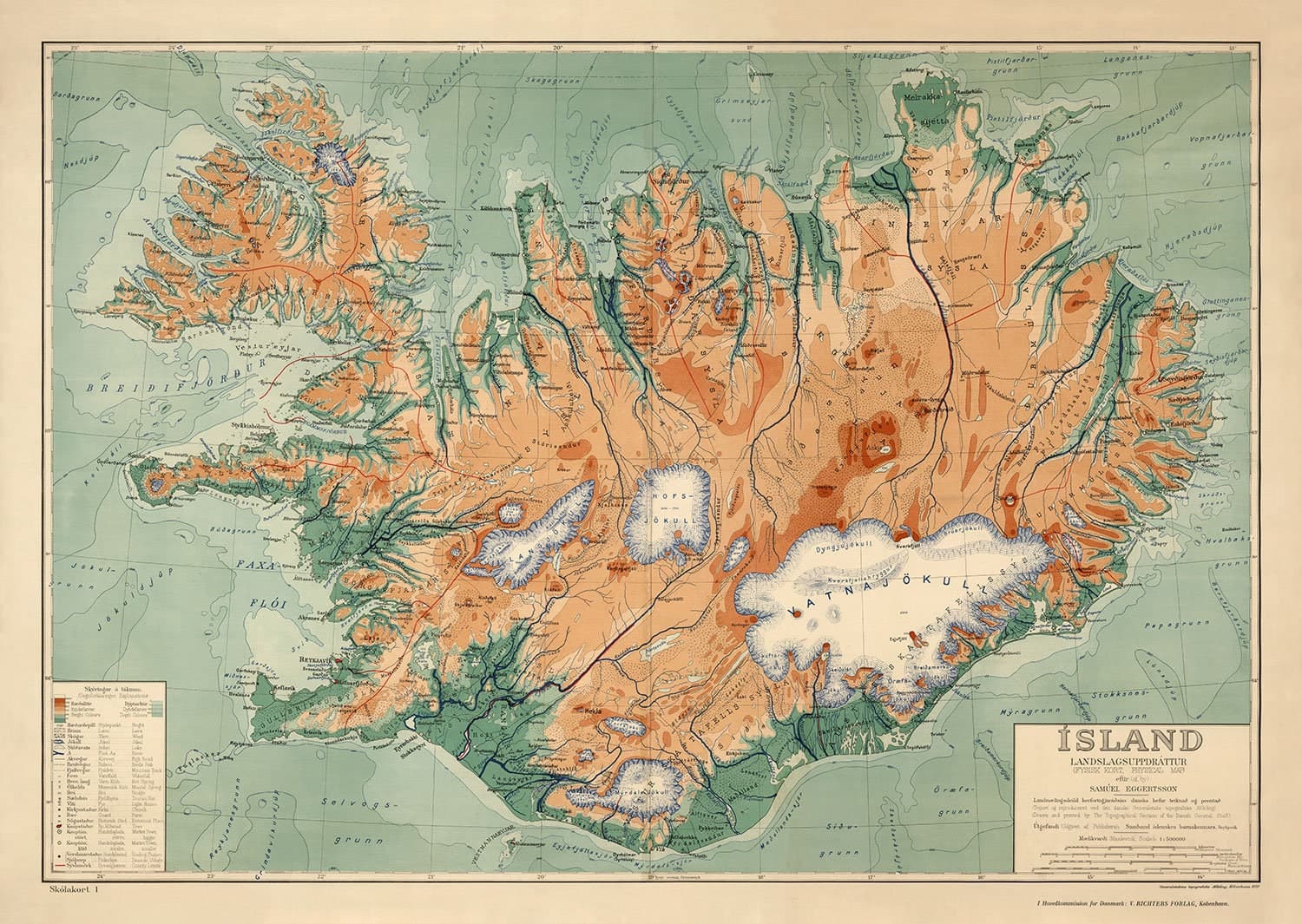 A lovely, colourful, antique and educational map of Iceland put together by Samuel Eggertsson and published in 1928.