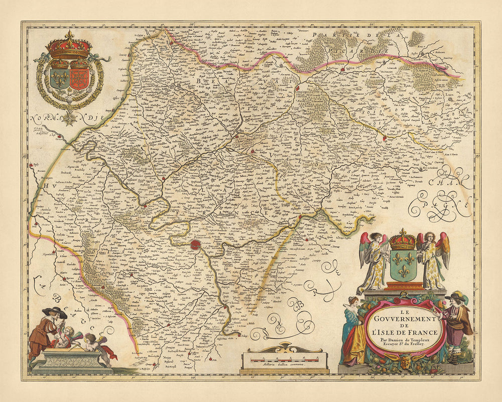 In addition to cities, the map also highlights various landmarks and geographical features. One such feature is the Vexin Français Regional Nature Park, a protected area of woodland, farmland, and historic towns. This map is more than just a geographical representation; it is a work of art. The hand-colored outlines, engraved details, and decorative cartouches add to its aesthetic appeal. It also features the coats of arms, a symbol of pride and identity, further enriching its historical value.