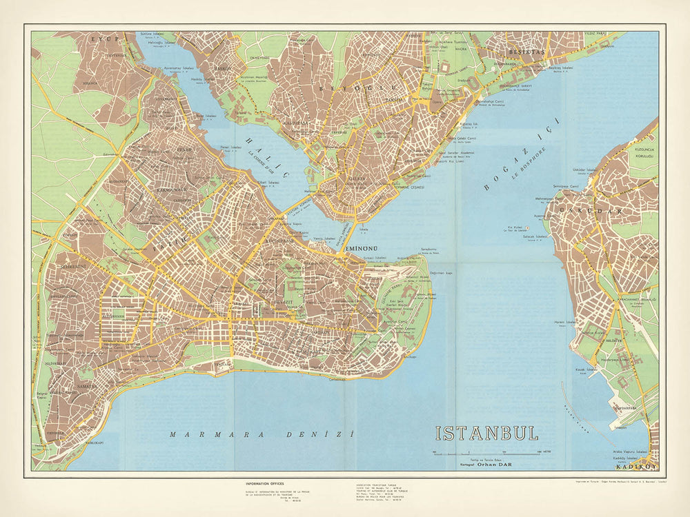 Discover the captivating allure of Istanbul through the "City Street Map of Istanbul," a remarkable cartographic masterpiece from the 1960s. Crafted by the esteemed Ministry of Press-Publication and Tourism, this map captures a transformative era in Istanbul's rich history. It showcases the city's vibrant urban landscape during a period of rapid development, influenced by the 1953 Tourism Industry Encouragement Law. This law played a pivotal role in shaping the city's modern identity, exempting investors from taxation and fostering a burgeoning tourism industry.