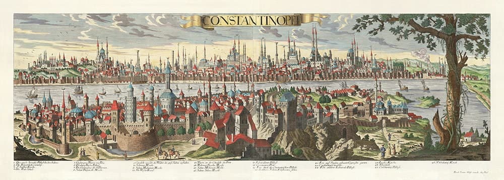 This map was produced at the height of the Ottoman Empire and you can clearly see the fascinating mix of Byzantine (Christian) and Ottoman (Islamic) architecture - notably, lots of domes and minarets. All in all, one of the most beautiful old maps of Istanbul ever produced.