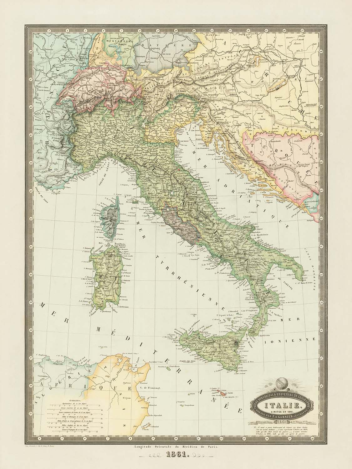 Step into the pivotal moment of Italian history with "Italie Limites En 1861," a masterwork by the esteemed French cartographer F.A. Garnier. Created in the very year of Italy’s unification, this map captures the dramatic transformation of the Italian peninsula as disparate kingdoms and duchies coalesced into a single nation. The original French title, elegantly scripted and framed by a decorative vignette, immediately evokes the grandeur and significance of this watershed year. Garnier’s meticulous attention to detail and his refined sense of artistry are evident in every wash of color and in every carefully rendered border.