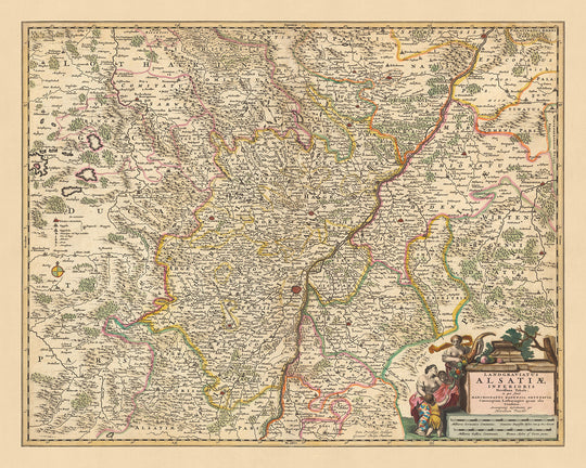 Step back in time with this meticulously detailed map of Lower Alsace, crafted by the esteemed mapmaker Nicolaes Visscher II in 1690. Visscher, a prominent figure in the Dutch Golden Age of cartography, hails from a lineage of distinguished mapmakers, making this piece not just a map, but a piece of history.