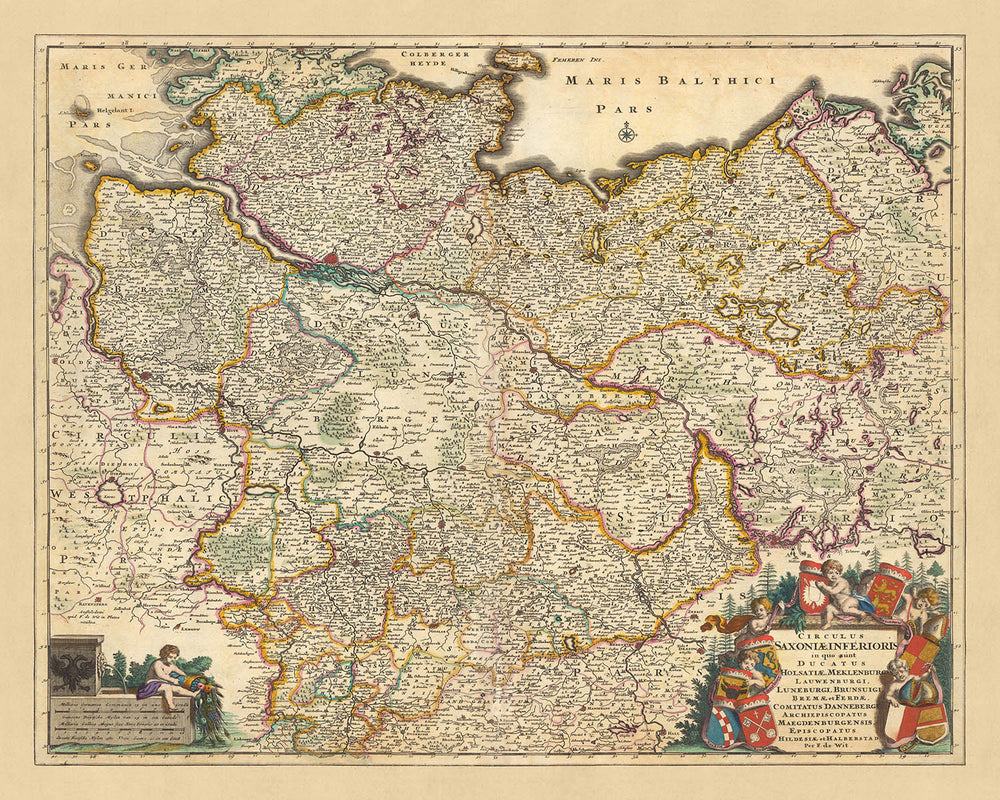 Delve into the intricate details of the 'Circulus Saxoniae Inferioris', a meticulously crafted map by Nicolaes Visscher II, a renowned mapmaker from the Dutch Golden Age. This exquisite piece, dating back to 1690, is a testament to Visscher's cartographic prowess and keen eye for detail. It presents an accurate and comprehensive representation of Lower Saxony, a region that holds a significant place in the larger modern-day area of Germany.