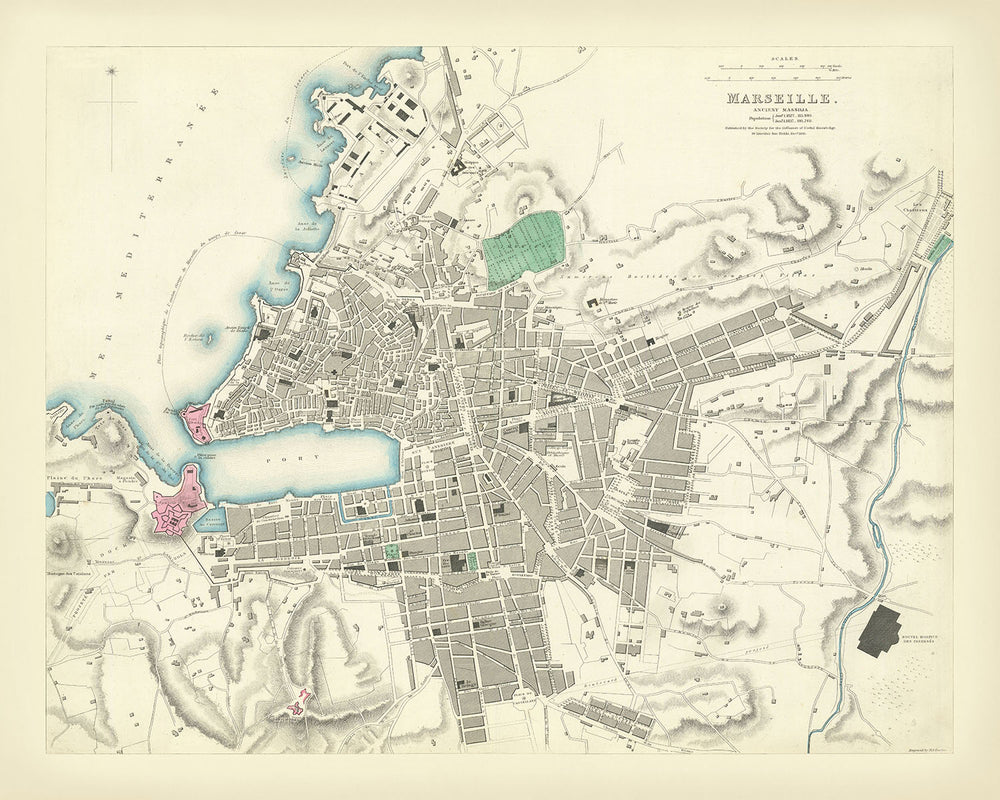 The "Marseille" map, crafted by the esteemed Society for the Diffusion of Useful Knowledge (SDUK) in 1870, is a captivating window into the historical urban landscape of one of France's most significant port cities. This antique map is celebrated for its meticulous detail and exceptional quality, making it one of the finest representations of Marseille published in a commercial atlas during the 19th century. It vividly captures the intricate street layout, key landmarks, and topographical features, offering a fascinating glimpse into the city's past.