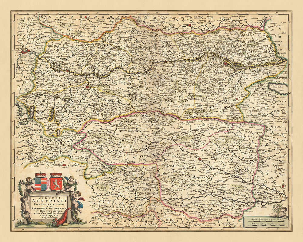 Step back in time with this intricate and fascinating map, 'Circuli Austriaci pars septentrionalis in qua Archiducatus Austriae et Ducatus Stiriae accuratissime divisi ostenduntur', by renowned mapmaker Nicolaes Visscher II. Translated from Latin, the title means 'The Northern part of the Austrian Circle in which the Archduchy of Austria and the Duchy of Styria are shown divided most accurately'. This map, crafted in 1690, provides a detailed snapshot of the political and geographical landscape of the time.