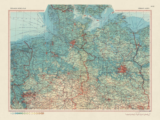 The map's content is rich and diverse, showcasing significant cities, towns, regions, landmarks, borders, mountains, and natural phenomena. It offers a unique insight into the historical and geographical context of northern Germany during the mid-20th century. The map's detailed representation of the states, including North Rhine-Westphalia, Schleswig-Holstein, Bremen, Hamburg, Lower Saxony, Saxony-Anhalt, Brandenburg, Berlin, Mecklenburg-Vorpommern, offers a captivating exploration of the region's geography and history.