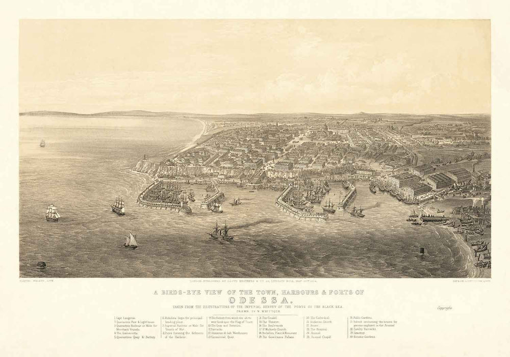 A charming and exceptionally rare early birds-eye view of Odessa, originally published in 1855 by N. Whittock out of London.