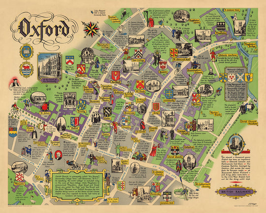 "Oxford," a map originally published in 1949 by J.P Sayer, is a captivating piece that invites viewers to explore the illustrious city of Oxford. This city map is a thematic and pictorial representation of the city, offering a unique perspective of Oxford's historical and cultural landscape. Notably, it is a pictorial poster map that was once used by British Railways to promote rail travel, a testament to the map's historical significance and its role in shaping travel and tourism in the mid-20th century. The map is rich in detail, covering the area from St. John's and the Ashmolean at the left edge to the River Cherwell and Broad Walk at the right edge, and from Balliol Cricket Ground and Manchester College to Magdalen at the upper edge and from Worcester to Campion Hall at the lower edge.