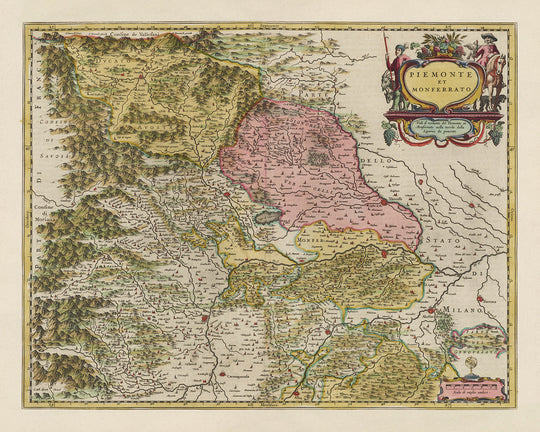 Piedmont and Monferrato, a region in northwest Italy, is depicted in this beautifully hand-colored map from 1665. The map, created by renowned Dutch cartographer Joan Blaeu, showcases the region's rich history and geography.