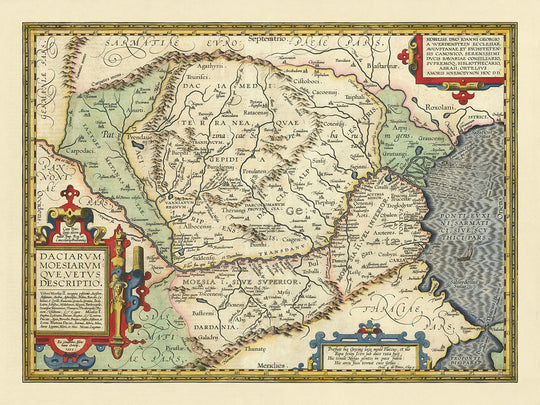 Old Map of Romania and Bulgaria by Ortelius, 1603: Danube River, Carpathian Mountains, Black Sea, Dacia, Moesia