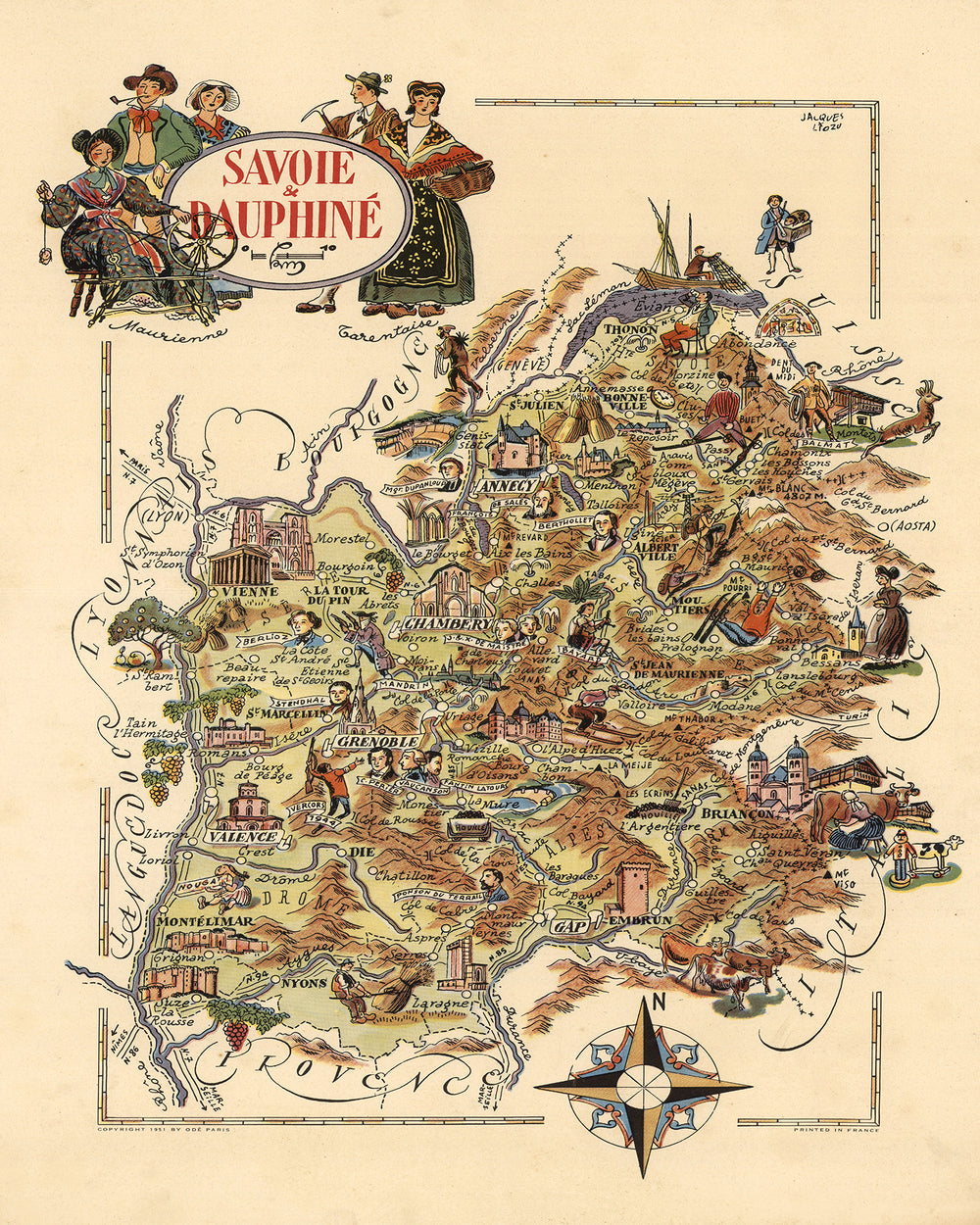 Old Map of Savoie & Dauphine, France by Jacques Liozu, 1951: Alps, Grenoble, Chambéry, Annecy