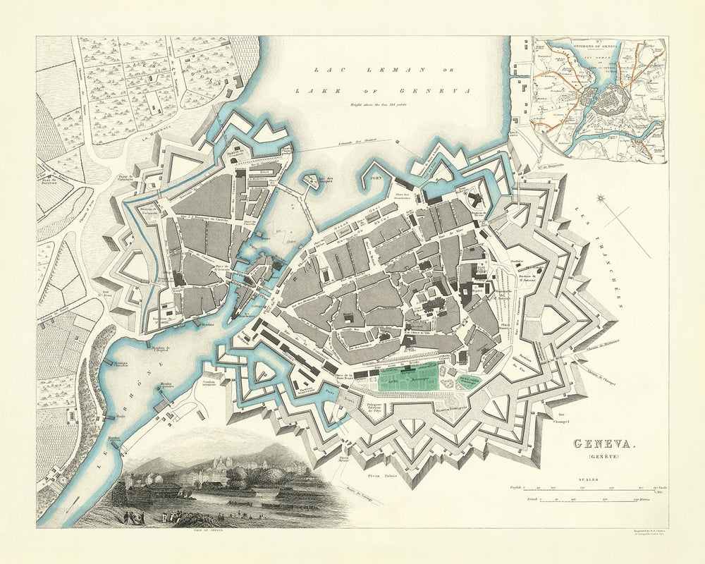 Old Map of Geneva by SDUK, 1870: Lake Geneva, Rhone River, Jardin Botanique, Massive Bastion Fort Fortifications