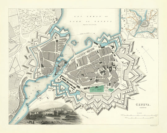 This map is not only a valuable historical document but also a work of art that captures the essence of Geneva's rich history and vibrant urban landscape. It serves as a testament to the skill and artistry of the cartographers who created it and offers a glimpse into the city's past, making it a captivating addition to any collection of antique maps.