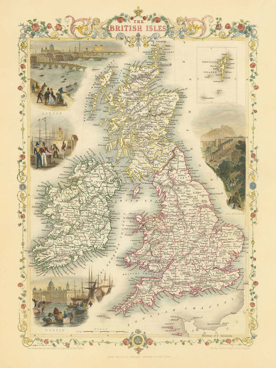 John Tallis, renowned as one of the last great decorative mapmakers, infused his works with both scientific accuracy and aesthetic flourish. His maps are prized not only for their geographical detail but also for their evocative vignettes—striking illustrations that capture the spirit and character of the lands they depict. On this map, you’ll find exquisite scenes of London, Edinburgh, and Dublin, each rendered with a romantic sensibility that transports the viewer to the bustling heart of these historic cities. Tallis’s dedication to both beauty and accuracy makes this map a quintessential example of 19th-century cartographic excellence.