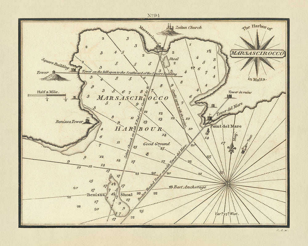 Old Marsaxlokk Harbor, Malta Nautical Chart by Heather, 1802: Marsascirocco Bay, Benisa Tower, Zeitun Church