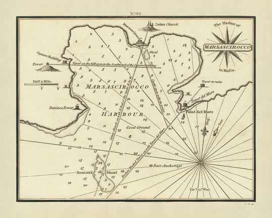 Delve into the rich maritime history of the Mediterranean with "The Harbor of Marsascirocco in Malta," an exquisitely detailed chart crafted by the renowned London publisher and engraver, William Heather, in 1802. This chart is not merely a navigational aid but a window into the strategic importance of Marsaxlokk, a key harbor on the southern tip of Malta. The map meticulously documents soundings, anchorages, and topographical features, serving as an indispensable tool for sailors and a fascinating artifact for historians.