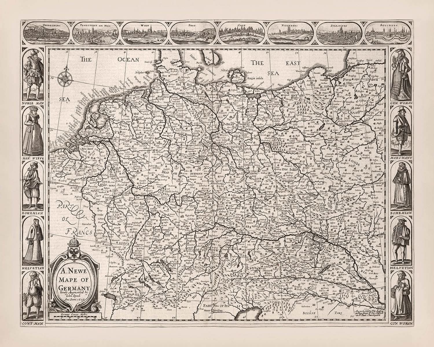 Old Monochrome Map of Germany by Speed, 1626: Berlin, Hamburg, Munich, North Sea, Baltic Sea