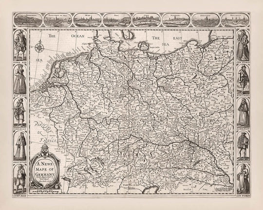Step into the captivating world of 17th-century cartography with "A Newe Mape of Germany," crafted by the renowned English cartographer John Speed in 1626. This exquisite map offers a glimpse into the political and physical landscape of Germany as it was understood during the early modern period. Speed's meticulous attention to detail and artistic flair make this map not only a geographical document but also a work of art. The map is adorned with illustrations of figures in traditional attire, adding a cultural richness that transports the viewer back in time.