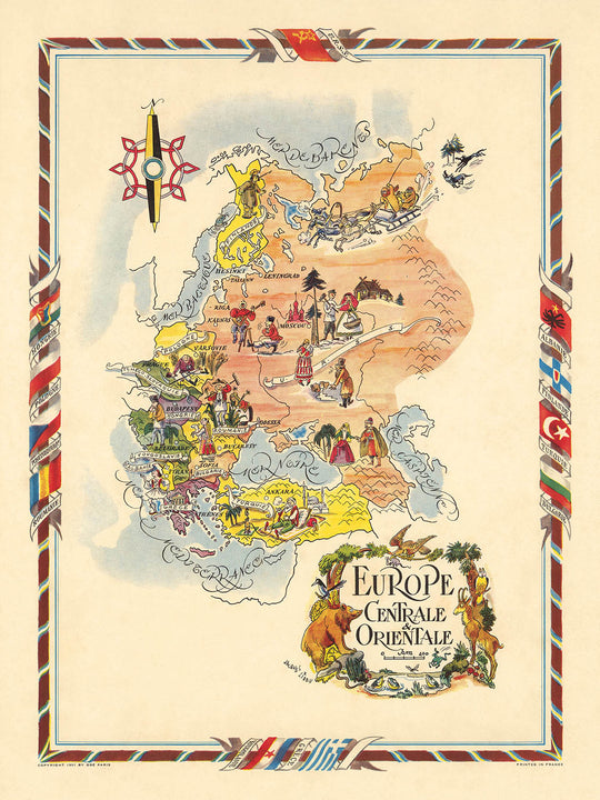 "Europe Centrale et Orientale," crafted by the renowned Jacques Liozu in 1951, is a stunning pictorial map that captures the essence of Central and Eastern Europe during a pivotal era. Liozu, celebrated for his thematic and pictorial cartography, imbues this map with intricate details that reflect the cultural, industrial, and agricultural richness of the region. The map is a vibrant tapestry of nations, each illustrated with symbols of their unique contributions to the continent's economy and heritage. This map is not just a geographical representation but a visual narrative of post-World War II Europe, a period marked by reconstruction and transformation.