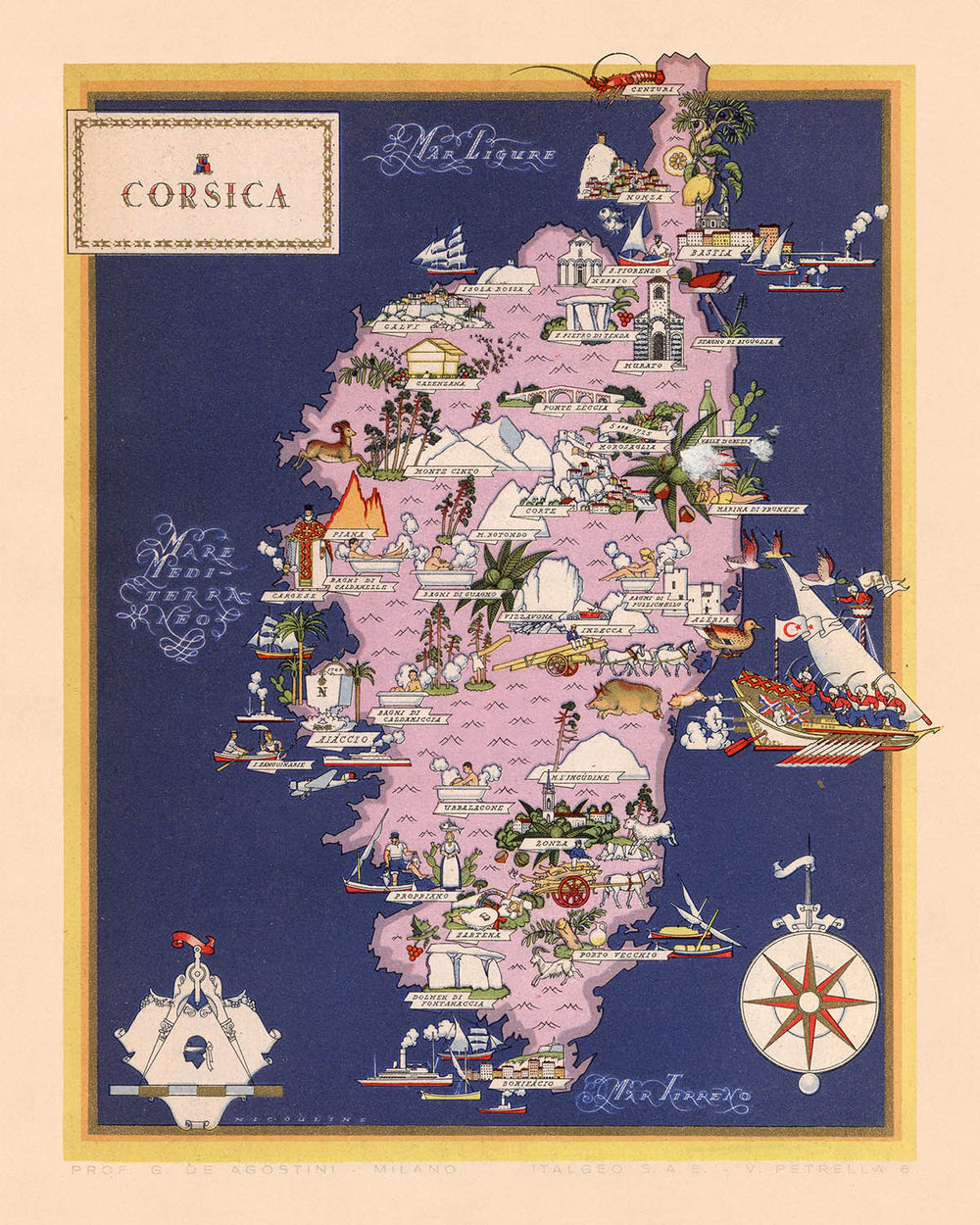 This Italian Region of Corsica map, originally published in 1938 by the Italian cartographic company, Giovanni De Agostini, is a beautiful and detailed example of a thematic and pictorial map. The map focuses on the Italian Region of Corsica, located in the Mediterranean Sea, and provides a wealth of information about the region's geography, history, and culture.