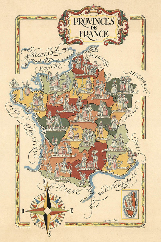 Old Pictorial Map of France's Provinces and Corsica by Liozu, 1951
