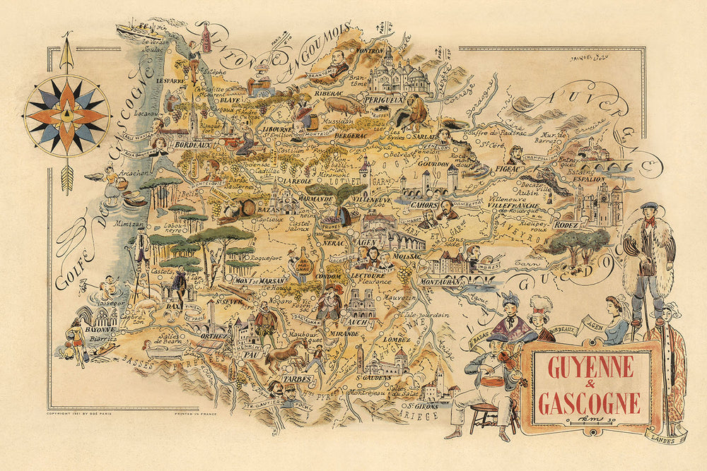 Historically, the map offers a snapshot of Guyenne and Gascogne as they were perceived in the mid-20th century, providing valuable insights into the cultural and historical context of the time. The detailed illustrations and thematic elements capture the essence of the regions, making the map a valuable resource for historians and collectors alike. Jacques Liozu's "Guyenne & Gascogne" map is not just a geographical tool but a work of art that encapsulates the rich heritage and cultural diversity of these historic French provinces.
