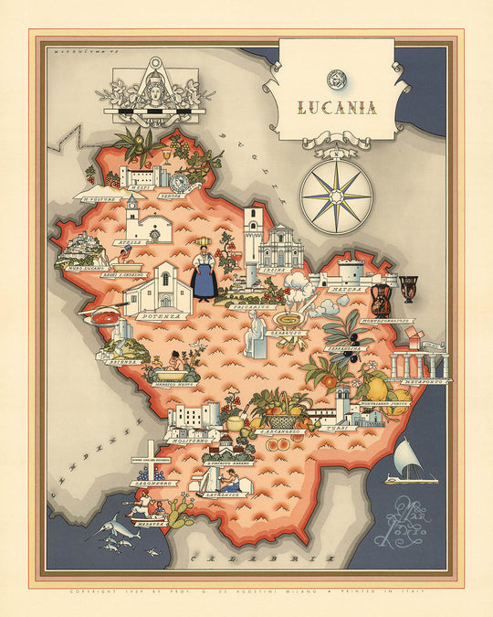 This Italian Region of Lucania map, originally published in 1938 by the Italian cartographic company, Istituto Geografico De Agostini, is a beautiful and detailed example of a thematic and pictorial map. The map's main focus is the Italian region of Lucania, which is now known as Basilicata. This region is located in Southern Italy and is known for its rich history, culture, and natural beauty. The map is adorned with colorful vignettes that depict various aspects of the region, including its architecture, agriculture, and natural resources. Towns and cities are clearly labeled, and the map also features silver and gilt accents, adding to its luxurious appearance.