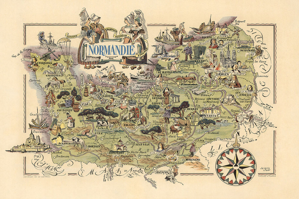 - Notes: Color pictorial map of Normandy Region, France. Includes compass rose. Relief shown pictorially.