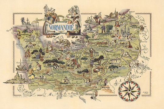 In summary, Jacques Liozu's "Normandie" map is a masterful fusion of art, history, and geography. It captures the essence of Normandy with a richness and depth that few maps can rival. From its detailed illustrations of historical landmarks and natural wonders to its thematic focus on cultural heritage, this map is a celebration of Normandy's past and present. Whether as a decorative piece or a historical document, it stands as a testament to Liozu's skill and vision as a cartographer.