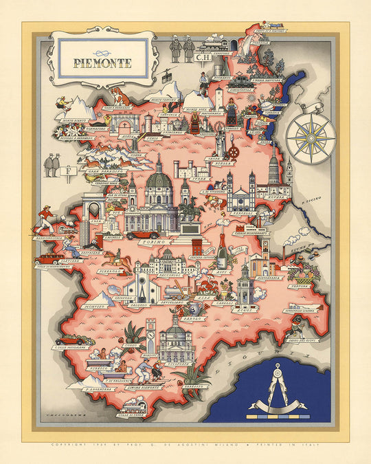 Old Pictorial Map of Piedmont by De Agostini, 1938: Turin, Novara, Vercelli, Biella, Alessandria