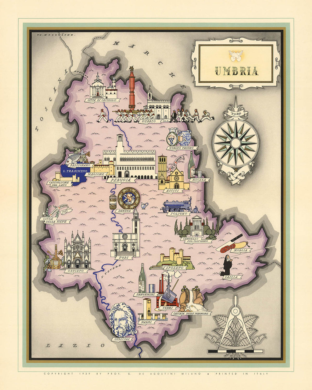 This Italian Region of Umbria map, originally published in 1938 by the Italian cartographic company, Istituto Geografico De Agostini, is a beautiful and detailed example of a thematic and pictorial map. The map's main focus is on the Italian region of Umbria, and it features colorful vignettes of structures, nature, activities, products, and crops that are native to the region. Towns and cities are clearly labeled, and the map is embellished with silver and gilt accents.
