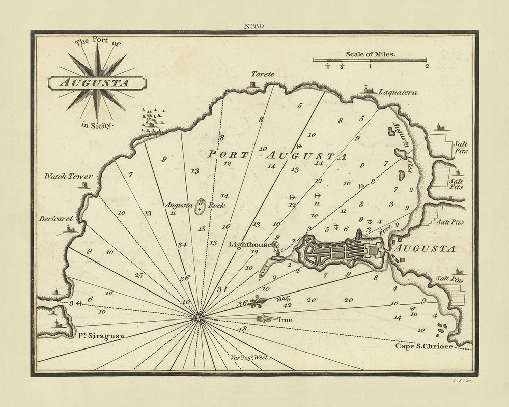 The chart is a testament to the high level of craftsmanship during the early 19th century, with fine engravings that are vividly brought to life by John Stephenson, a distinguished London engraver known for his monogrammed works. Oriented with west at the top, this chart not only guides through the practical details of maritime navigation but also serves as a piece of art. It details the coastline of Augusta, highlighting key features such as the town, its strategic port, and the iconic Augusta lighthouse, all intricately engraved to provide both aesthetic pleasure and functional value.