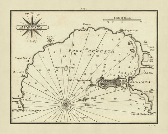 Delve into the rich maritime history of the Mediterranean with the exquisite chart, "The Port of Augusta in Sicily," crafted by the renowned cartographer William Heather in 1802. This chart is not merely a navigational aid but a window into the past, showcasing Heather's meticulous attention to detail and commitment to accuracy. As part of Heather's pioneering work, The New Mediterranean Pilot, this chart represents the first English endeavor to systematically document the Mediterranean's ports, a task previously dominated by French, Italian, and Spanish cartographers. The precision of Heather's charts marked a significant advancement from the earlier, more crudely executed maps, setting a new standard in cartographic finesse.