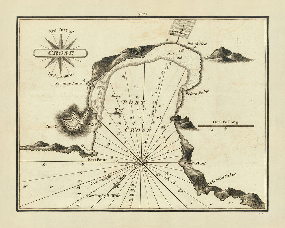 Navigational Details and Map Features "The Port of Crose" is a testament to the era's navigational challenges and Heather's cartographic precision. Employing the Mercator projection, known for its ability to preserve angle fidelity, the chart is an indispensable tool for historical navigation studies. It meticulously details the coastline, depth soundings, and maritime hazards, including the notorious shipwreck site marked as 'Wreck' on the chart. Notable landmarks such as Fort Cros, Prior's Well, and the ominously named Mud area are distinctly marked, providing a comprehensive view of the port's defensive and resource structures.