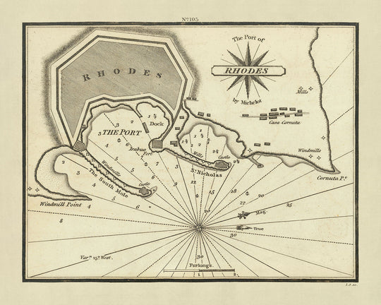 "The Port of Rhodes" is a captivating nautical chart crafted by the esteemed William Heather in 1802, a period marked by maritime exploration and the expansion of navigational knowledge. This chart is a significant artifact from Heather's pioneering work, The New Mediterranean Pilot, which stands as the first English endeavor to systematically document the Mediterranean's myriad ports. Unlike its French and Italian predecessors, which began with Joseph Roux's 1764 publication in Marseilles, Heather's charts are distinguished by their meticulous engraving and clarity, a testament to the skilled hands of London engraver John Stephenson.