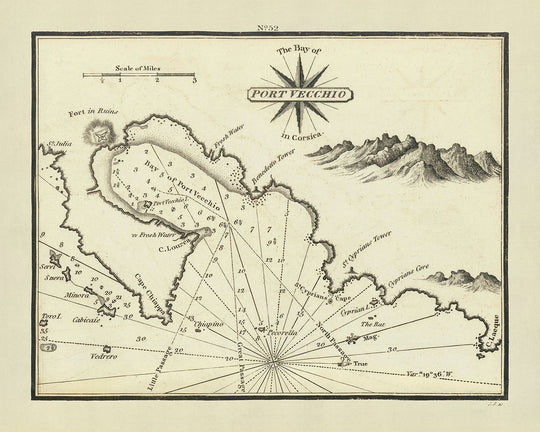 In conclusion, "The Bay of Port Vecchio in Corsica" is more than just a map; it is a historical document that captures the essence of Corsican maritime history. Its detailed depiction of nautical and topographical features, combined with its rich historical annotations, makes it an invaluable resource for anyone interested in the Mediterranean's naval history. The craftsmanship of William Heather, enhanced by John Stephenson's fine engravings, ensures that this chart remains a testament to the art and science of early 19th-century mapmaking.