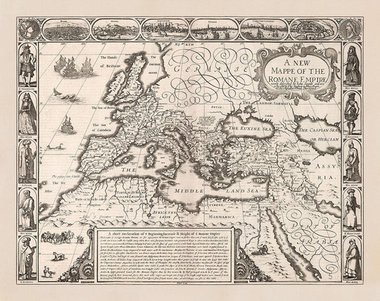 This is a rare, monochrome map of the Roman Empire from 1626 by the most famous cartographer of his time, John Speed. The map shows the Roman Empire at its largest, spanning all the way from the British Isles to North Africa to Assyria (modern-day Iraq/Iran).