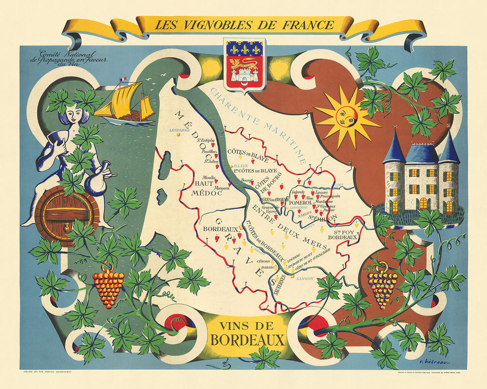 Les Vignobles De France -- Vins De Bordeaux, crafted by the illustrious French artist Remy Hetreau in 1954, is a masterpiece that captures the essence of Bordeaux's wine-producing regions. This exquisite map, one of a series of 11, was commissioned by the Comité National de Propagande en Faveur du Vin, a French government agency dedicated to promoting the nation's wine industry. Hetreau's work not only highlights the geographical intricacies of Bordeaux but also serves as a vibrant promotional tool for both wine and tourism. The map is adorned with clusters of grapes, using red for red wines and yellow for white wines, making it a visually striking and informative piece.