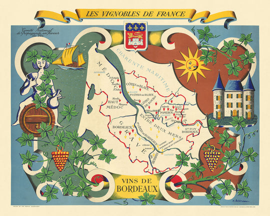 The map's design is a harmonious blend of thematic and pictorial elements, featuring a compass rose, a sailing vessel, a chateau, and a decorative border with grapevine motifs. These artistic elements frame the map, drawing the viewer's eye to the central depiction of Bordeaux's wine-producing areas. The use of vibrant colors to differentiate between red and white wine regions adds a layer of clarity and visual appeal, making it easy to understand the geographical distribution of Bordeaux's renowned vineyards. The inclusion of a sun illustration and an illustrated figure playing a musical instrument further enhances the map's charm and character.