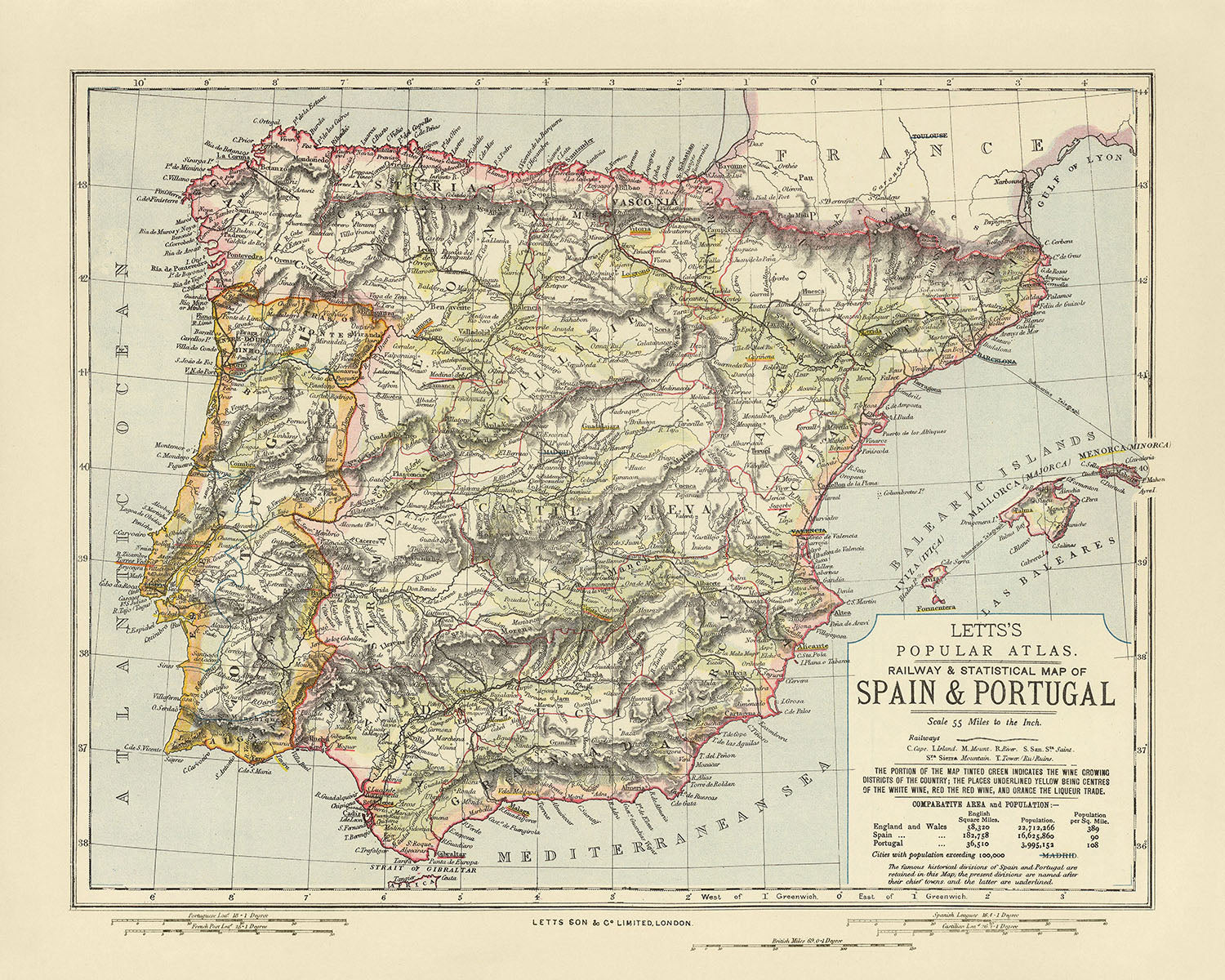 Uniquely, this map goes beyond mere geography to explore the flourishing wine regions of Spain and Portugal, making it an essential piece for any wine enthusiast's collection. The wine-growing areas are meticulously shaded in green, with specific regions underlined in yellow for white wines, red for red wines, and orange for liqueur regions. This thematic element not only adds a layer of utility to the map but also serves as a historical snapshot of the viticultural practices prevalent in the 19th century, offering insights into the agricultural and economic landscapes of the time.