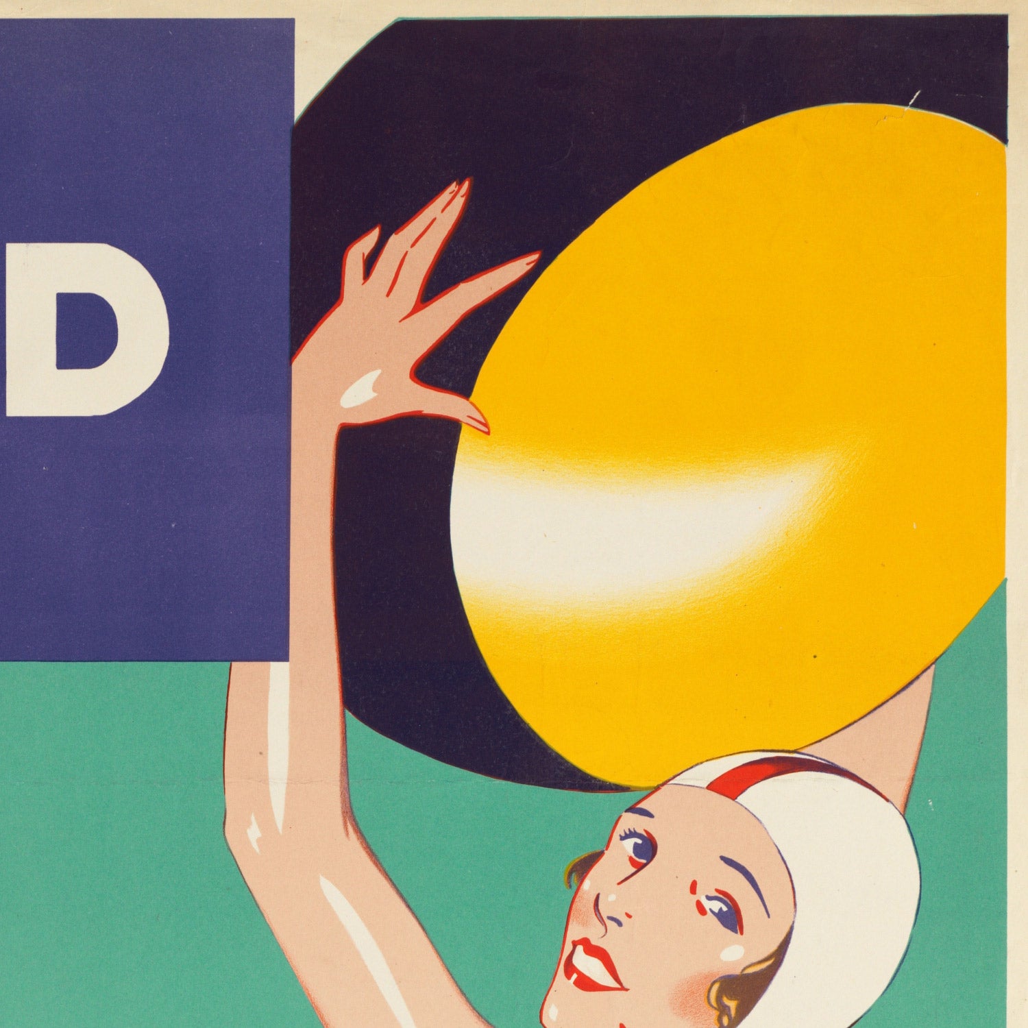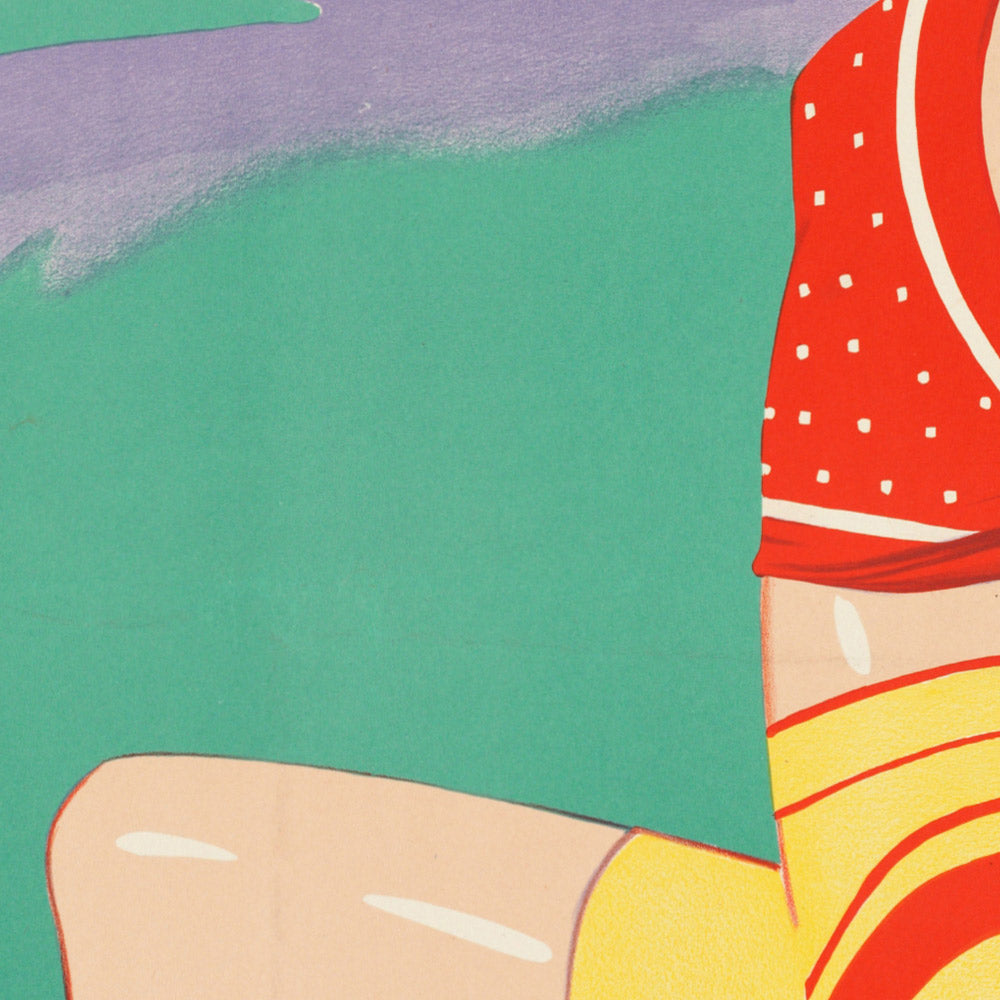 Color is central to its impact. The dominant blues and sea-glass turquoise of the ocean set a cooling field for the sun’s warm yellow and the lively pops of red, while the white highlights and clean, assured strokes keep the composition bright and buoyant. Curvilinear waves dance against the taut geometry of the lettering, and the dotted patterning on the swimsuit adds playful texture. The result is a timeless focal point that suits coastal interiors, modern spaces with Art Deco accents, or a gallery wall of vintage travel prints.