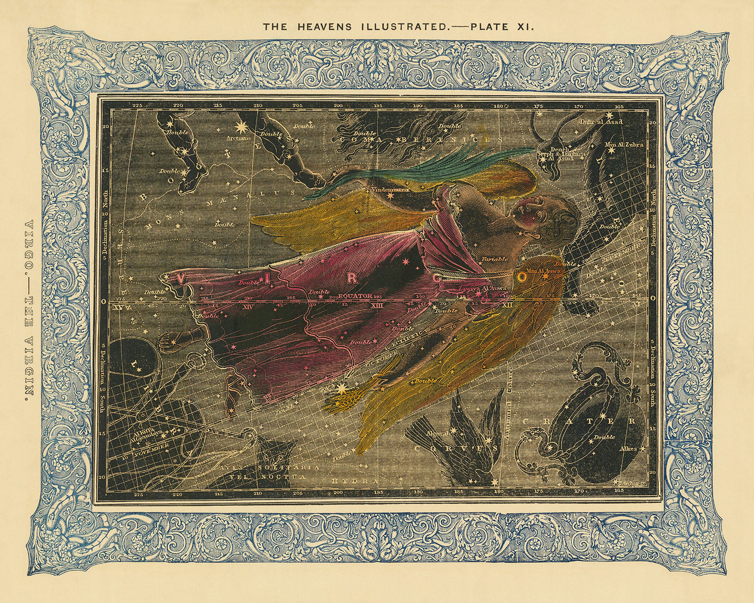 "Virgo, The Virgin" is an exquisite handcoloured old star chart meticulously created by Duncan Bradford in 1837. This rare celestial map of the constellation Virgo was originally published in the renowned geographical work, The Wonders of the Heavens, and now, it can grace the walls of your home as a high-quality fine art print.