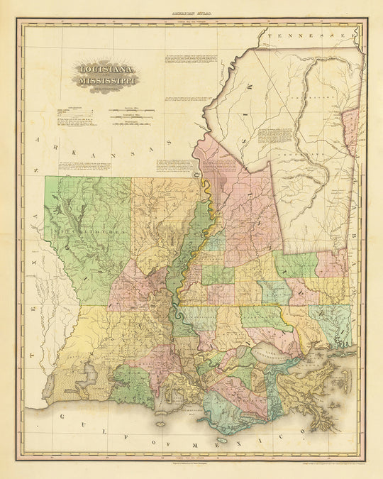 Immerse yourself in the rich history and fascinating geography of the Southern United States with this exquisite map of Louisiana and Mississippi, drawn by celebrated cartographer H. S. Tanner in 1820. This meticulously detailed reproduction showcases the precision and careful craftsmanship for which Tanner was renowned, depicting the region's settlements, natural landmarks, and geographical features with extraordinary clarity and accuracy. This map encapsulates a pivotal period in the history of these states, right after the War of 1812 and at the cusp of the westward expansion. It serves as a testament to the significant transformation that the landscape underwent during this time, making it a collector's dream and an irreplaceable addition to any history or cartography enthusiast's collection.