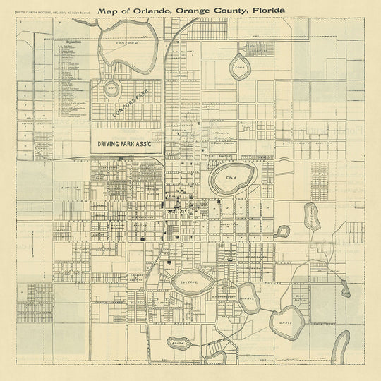 Orlando, then a small but rapidly growing city, is the central focus of the map. The street grid system, a defining characteristic of American cities, is evident, with numbered streets running north-south and named streets running east-west. The city's main thoroughfares, such as Orange Avenue and Central Avenue, are prominently displayed, highlighting their importance as commercial and transportation corridors.